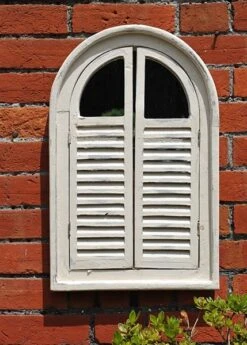 The continental-style wooden shutters have been painted and weathered to give them an authentic aged appearance. Keep the mirror as clean and smear-free as possible for best results.