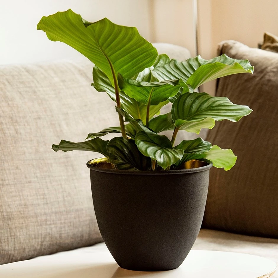 Textured black spun steel pot cover with soft rounded sides and a contrasting warm brass interior. Ideal for all green foliage plants.