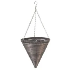 Attractive slate grey cone planter, hand woven from durable rot-proof poly rattan. Supplied pre-lined ready for planting and includes a 3-point galvanised metal chain with hook attachment.