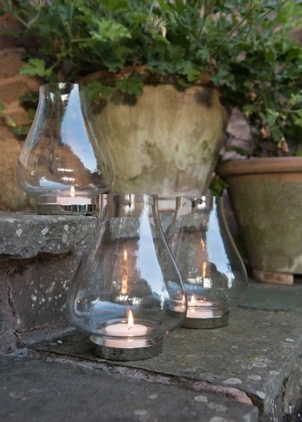 A classic outdoor dining candle or tealight holder made from clear blown glass with a nickel plated base.